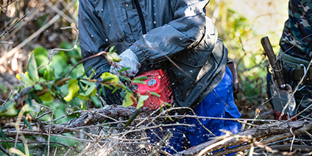 苗木が雑草よりも大きく成長し、下草刈りの必要がなくなっても、クズ・フジ・ツタなどのツルが幹に巻き付いたり、植栽木(苗木が苗木とは呼べない程度にまで育った木)に覆いかぶさったりするため、これを取り除かなければなりません。この作業を「つる刈り」といいます。スギの場合、植栽後10年ほどすると背丈が5m前後に成長します。この頃には植栽木の成長を邪魔するような灌木などを伐る作業を行います。この作業を「除伐」といいます。「除伐」では雪などで曲がってしまった植栽木や途中から折れてしまっている植栽木、成長が悪く大きく育つ見込みのない植栽木を刈る作業も行います。通常はチェーンソーを使って行います。なお最近では、森林の持つ多面的機能(公益的機能)をより発揮させるため、「除伐」を適度に行い周囲の樹木も残して針葉樹と広葉樹が共存する針・広混合林へ誘導していくことも推奨されています。