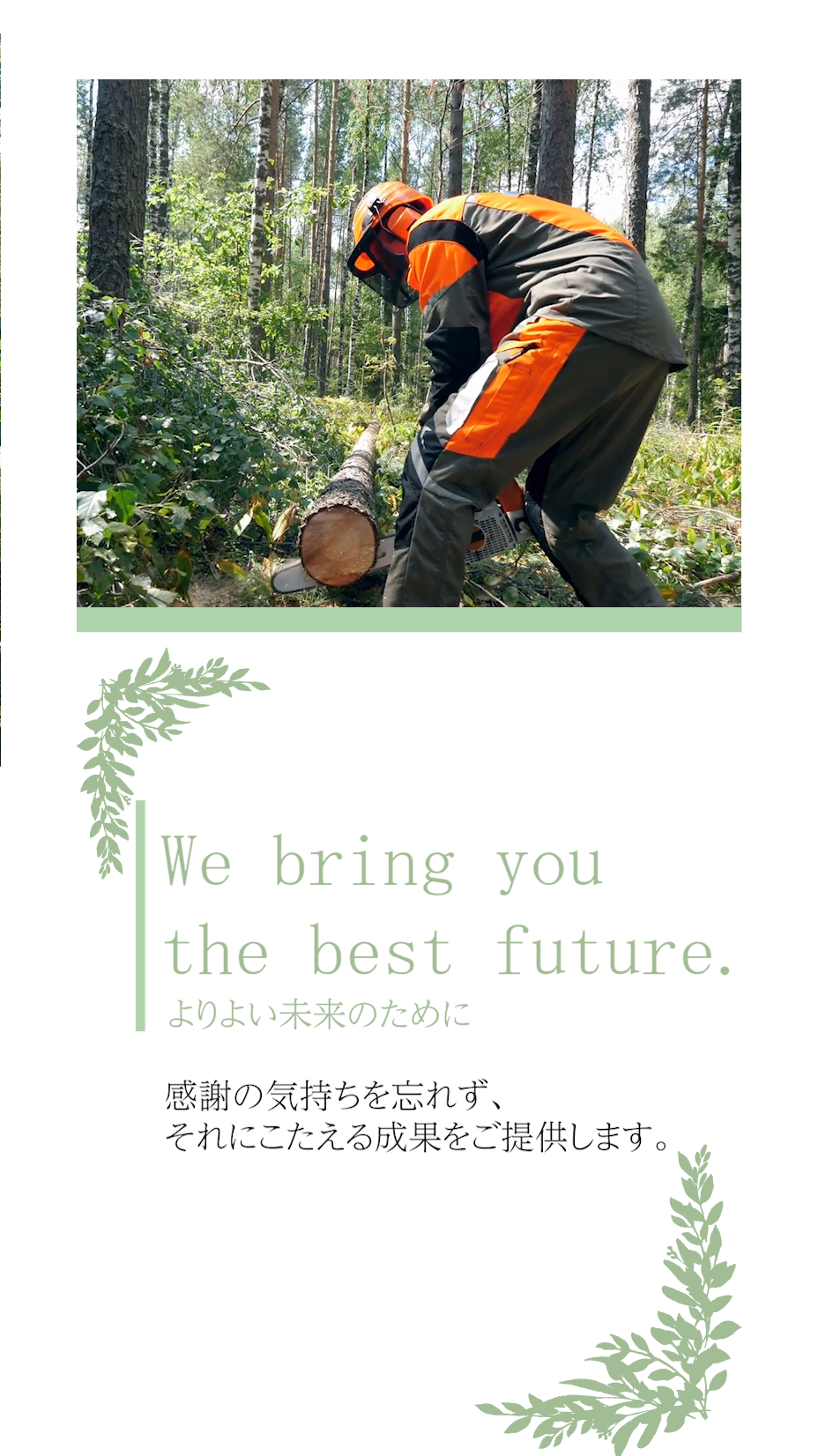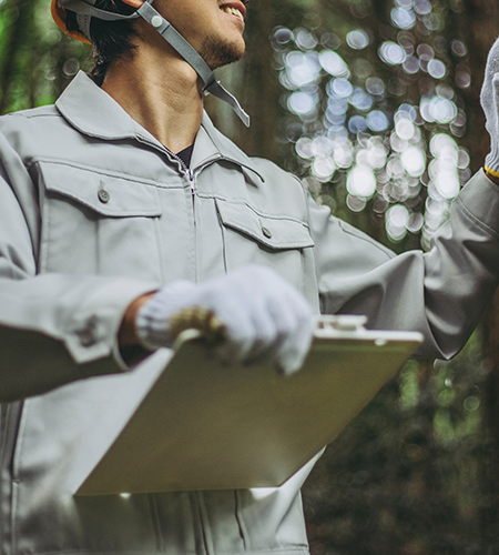 苗木を植えてから収穫するには、まず、苗木を植えるための土壌を整えてから苗木を植え、苗木が他の植物に負けないよう草を刈ったり、成長を促すように枝打ちをしたり、生育状況の悪い木や曲がった木など間引きながら、収穫を迎える50~60年間、大切に世話をします。この一連の作業を林業従事者が行います。