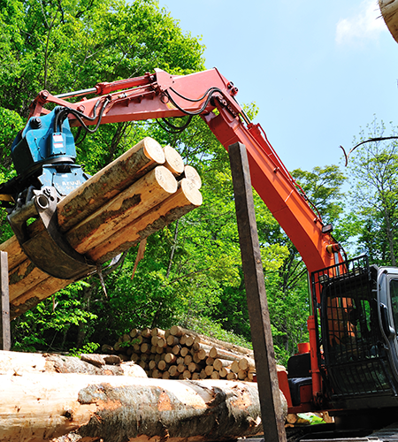 伐採(収穫)した丸太は、ケーブルなどで吊るして山から林道まで運び出されたり、ウインチで引っ張ったりして搬出されます。最近では高性能林業機械を使うケースも多くなりました。そして、積みおろし機などで集めてトラックに積み込まれ、原木市場や貯木場へ運ばれます。原木市場や貯木場へ運ばれた木材は競りで製材業者に買われます。また、直接製材工場に運搬される場合もあります。